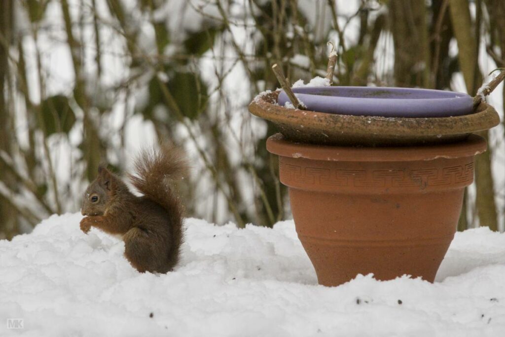 Das Eichhörnchen bei seiner Henkersmahlzeit. Es sitzt neben der beheizten Trinkschale. Gern angenommen in dieser Zeit von allen Gartenmitbewohnern.